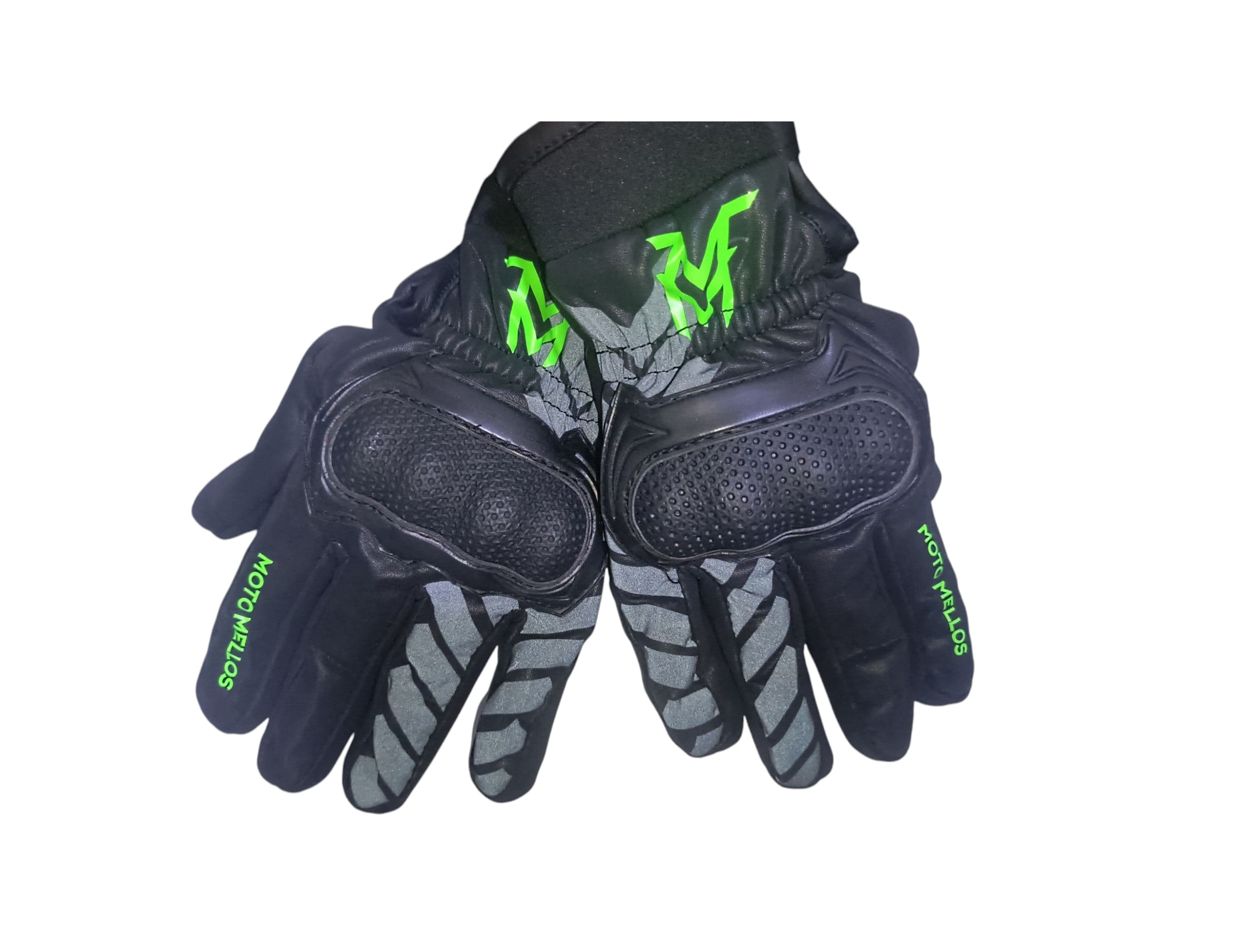 • Estilo moderno con logo Moto Mellos y acentos en verde flúor.